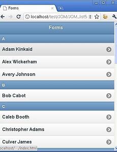 JQM60 jQuery Mobile - Theming Lists(리스트에 테마적용하기) 기본 스타일의 리스트의 디폴트 테마는 구분자는 b 테마로, 리스트 항목은 c 테마 입니다. Divider Inbox 12 Outbox 0 Sent 328 리스트의 테마를 셋팅하기 위해서는 리스트에 data-theme 속성을 사용합니다. Divider Inbox 12 Outbox 0 Sent 328 리스트의 특정 항목에 테마를 적용하기 위해서는 항목 태그에 data-theme 속성을 사용하면 됩니다. Divider Inbox 12 Outbox 0 Sent 328 Trash 34 Theming dividers 리스트 구분자에만 테마를 변경하고자 할 경우에는 data-divider-theme 속성을 사용합니다. Divider Inbox 12 Outbox 0 Sent 328 리스트의 카운트 수에 테마를 변경하고.. 2011. 7. 7. jQuery Mobile - Inset Lists(인셋 리스트) 만약, 리스트가 다른 타입의 컨텐츠를 갖는 페이지에 속해 작은 마진과 둥그런 모서리를 갖는 content area 내부의 블록 안에 추가된다면, data-inset=”true”속성을 리스트(ul or ol)에 추가하여 삽입된 페이지 모양을 적용합니다. Simple list Acura Audi BMW Cadillac Ferrari Count bubbles Inbox 12 Outbox 0 Drafts 4 Sent 328 Trash 62 Numbered list The Godfather Inception The Good, the Bad and the Ugly Pulp Fiction Schindler's List Divided, formatted content Stephen Weber You've been in.. 2011. 7. 6. jQuery Mobile - Lists with Forms(폼 리스트) 리스트 내부에 폼을 만들어 넣을 수도 있습니다. Text Input: Textarea: Search Input: Flip switch: Off On Slider: Choose as many snacks as you'd like: Cheetos Doritos Fritos Sun Chips Font styling: b i u Choose a pet: Cat Dog Hamster Lizard Layout view: List Grid Gallery Choose shipping method: Standard: 7 day Rush: 3 days Express: next day Overnight Your state: Alabama Alaska Arizona Arkansas California Colorado Conn.. 2011. 7. 5. jQuery Mobile - Read-Only Lists(읽기 전용 리스트) List view는 또한 인터렉티브하지 않은 리스트로 사용될 수 있습니다. 보통은 삽입된 리스트의 경우에 사용됩니다. 이 리스트는 링크를 갖지 않는 정렬된 혹은 비정렬된 리스트로 빌드 됩니다. 프레임웍크는 이러한 리스트를 디폴트로 c 테마의 스타일을 적용합니다. 그리고 클릭 가능한 리스트 보다 작은 사이즈의 text와 공간을 사용합니다. Simple list Acura Audi BMW Cadillac Ferrari Count bubbles Inbox 12 Outbox 0 Drafts 4 Sent 328 Trash 62 Numbered list The Godfather Inception The Good, the Bad and the Ugly Pulp Fiction Schindler's List Divide.. 2011. 7. 4. jQuery Mobile - Search Filter(검색 필터 리스트) JQM은 간단한 client-side의 검색요소를 갖는 필터를 쉽게 제공합니다. 필터가 가능한 리스트를 만들기 위해, 간단하게 data-filter=”true”속성을 리스트에 추가합니다. 프레임웍크는 리스트 위에 검색박스를 추가하고, 사용자 유형으로 현재 검색 문자열을 포함하지 않는 목록 항목을 필터링하는 동작을 추가합니다. Input의 placeholder text는 디폴트로 “Filter items…”라고 보여집니다. 이 문구를 변경하고 싶다며 mobileinit 이벤트에 바인드하여 $.mobile.listview.prototype.options.filterPlaceholder 옵션을 셋팅하거나, data-filter-placeholder 속성을 list view에 사용하여 셋팅할 수 있습니다. 검색.. 2011. 7. 1. jQuery Mobile - Thumbnails & Icons(썸네일과 아이콘 리스트) 리스트 항목 왼쪽에 thumbnail을 추가하기 위해, 리스트 내부에 첫번째 child 요소로 이미지를 추가하면 됩니다. 그러면 프레임웍크는 80 픽섹의 square로 이미지를 변형합니다. 표준 16x16 픽셀 아이콘을 사용하기 위해서는 이미지 요소에 ui-li-icon의 class를 추가하면 됩니다. Broken Bells Broken Bells Warning Hot Chip Wolfgang Amadeus Phoenix Phoenix Of The Blue Colour Of The Sky Ok Go Elephant The White Stripes Kid A Radiohead XX XX Congratulations MGMT Ashes Grammar A Sunny Day in Glasgow Hot Fuss .. 2011. 6. 30. jQuery Mobile - Text Formatting & Counts(텍스트와 리스트 카운트) 프레임웍크는 HTML 의미적 마크업을 통해 해더/설명, 보조정보, 카운트와 같은 일반적인 목록 패턴에 대한 텍스트 서식 규칙을 포함하고 있습니다. - 리스트 항목 오른쪽에 숫자 indicator를 추가하기 위해, ui-li-count의 class를 갖는 요소안에 number로 감쌉니다. - 텍스트 계층을 추가하려면, 제목의 폰트를 강조하고 강조를 사용하지 않는 구문을 사용합니다. - 보조 정보는 ui-li-aside의 class를 갖는 요소를 감싸서 리스트 항목의 오른쪽에 추가되어집니다. Friday, October 8, 2010 2 Stephen Weber You've been invited to a meeting at Filament Group in Boston, MA Hey Stephen, if y.. 2011. 6. 29. jQuery Mobile - List dividers(리스트 구분자) List 항목은 구분선으로 나누거나 리스트 항목 그룹으로 만들 수 있습니다. 어떤 리스트 항목이더라도 data-role=”list-divider” 속성을 추가만 하면 됩니다. 이러한 항목은 b 테마로 스타일 되어지지만, data-dividertheme 속성을 리스트 요소(ul 혹은 ol)에 사용하여 구분자 테마를 지정할 수 있습니다. A Adam Kinkaid Alex Wickerham Avery Johnson B Bob Cabot C Caleb Booth Christopher Adams Culver James D David Walsh Drake Alfred E Elizabeth Bacon Emery Parker Enid Voldon F Francis Wall G Graham Smith Greta Pee.. 2011. 6. 28. jQuery Mobile - Split Button Lists(분할 버튼 리스트) 리스트 항목에서 하나 이상의 가능한 액션이 있을 경우, split 버튼은 두가지의 독립적은 클릭 가능한 항목(리스트 항목과 오른쪽의 작은 화살표 아이콘)으로 사용할 수 있습니다. Split list를 만들기 위해, 간단하게 li 태그안에 두번째 링크를 추가하고 프레임웍크는 화살표모양의 아이콘에 링크